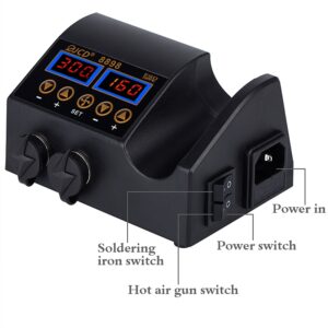 Hot air heater and welding iron 2in1 rework soldering station. Dual LCD digital displays to show precision temperature. Extremely low noise and space saving design. Intelligence self-detection function features safe personal operation. Automatic cooling function for effectively prolonging the heater’s life and protecting the hot air heater. Hot air gun Working Voltage: AC220-240V OR AC100-130V Frequency: 50Hz/60Hz Output Power: 800W Temperature Range: 100°C~480°C Temperature Stability:±2℃ Air Flow: 150L/min (max) Soldering iron Working Voltage: AC220-240V OR AC100-130V Output Power: 80W Frequency: 50Hz/60Hz Temperature Range: 180°C-500°C Temperature Stability: ±1°C Soldering Iron : ESD design Heater Material : Ceramics How to use: 1. Clean the electronic components to be soldered. 2. Once iron reaches temperature (not too high, recommend 300-400℃). 3. Apply a little solder to the heated iron tip to prevent oxidation, then rub the iron tip to evenly extend the solder to the surface of the iron tip. 4. Start to solder