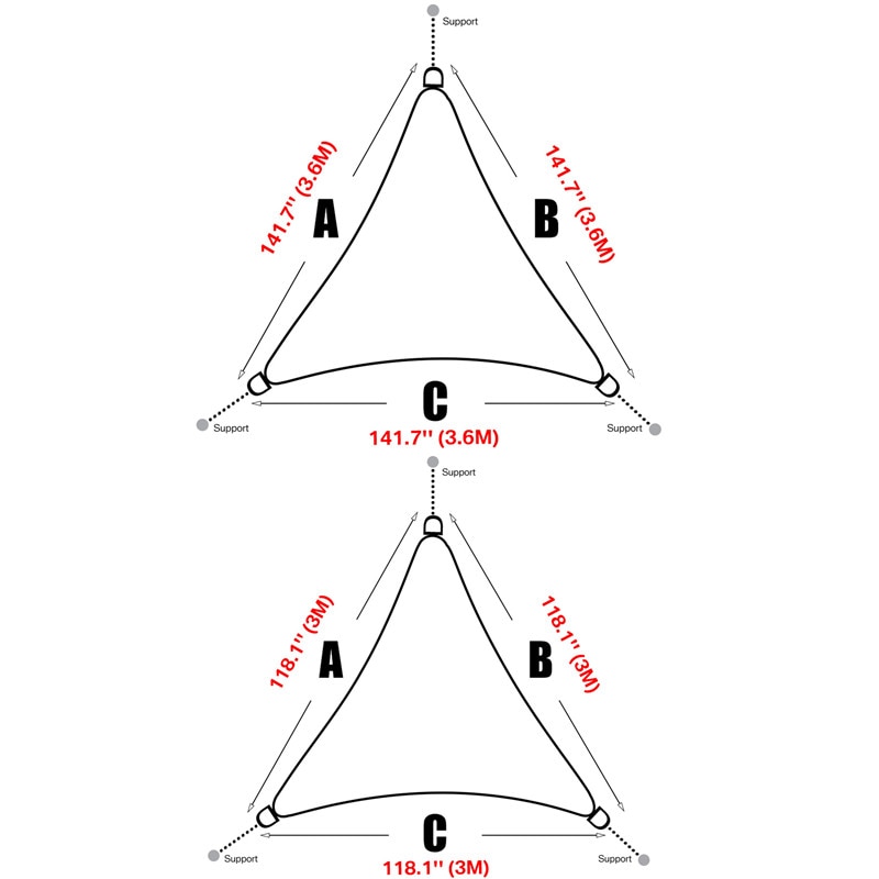 For Triangle shade sail:2x2x2M 3x3x3M, 3.6×3.6×3.6M,5x5x5M