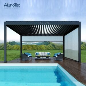 Our pergola design is powder coated, extruded aluminum with stainless steel components giving us the most durable louvered roof on the market today.